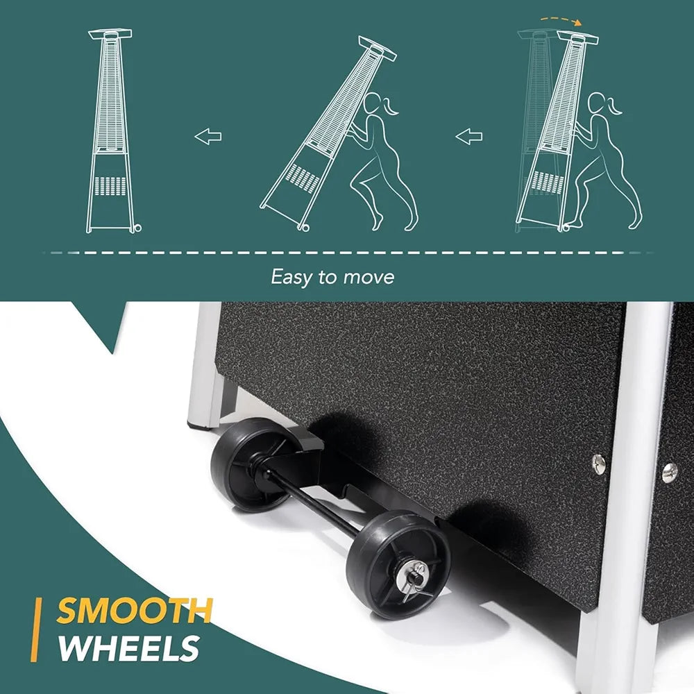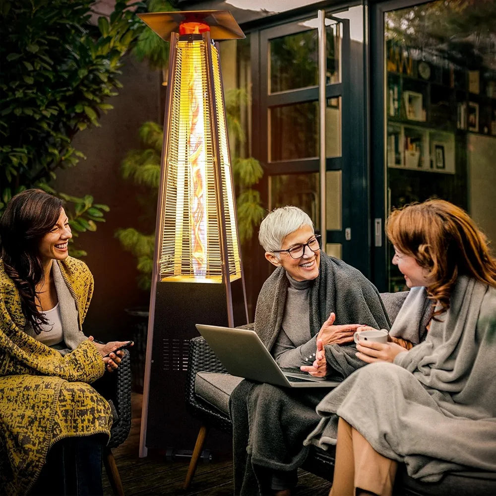 This Outdoor Patio Gas Heater features a distinctive pyramid-style design with tall glass tubes that showcase a beautiful column of flames, creating both warmth and a romantic atmosphere for any outdoor setting.